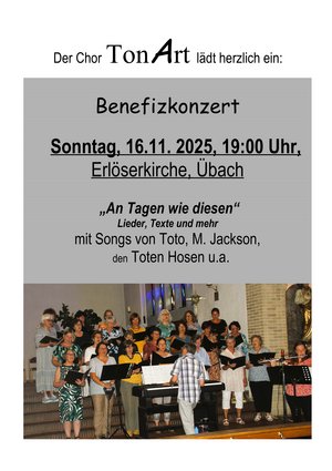 Wir laden herzlich ein zu einem Benefizkonzert des Chores TonArt am 16. November 2025 um 19.00 Uhr in der Erlöserkirche Übach.