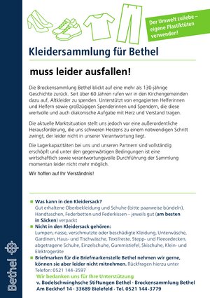 Die Altkleidersammlung für Bethel, die eigentlich im Oktober stattfinden sollte, ist kurzfristig durch Bethel abgesagt worden. Wir bitten daher dringend, uns keine Altkleider zu bringen, da auch wir nicht über genügend Lagerkapazität verfügen, um diese aufbewahren zu können, bis wieder eine Sammlung stattfindet. Vielen Dank für Ihr Verständnis!