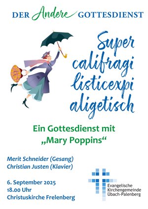 Zu einem Gottesdienst aus der Reihe „Der Andere Gottesdienst“ laden wir am 6. September 2025 um 18.00 Uhr in der Christuskirche Frelenberg herzlich ein. Dieses Mal werden wir einen ganz besonderen Gast begrüßen dürfen: Mary Poppins, das zauberhafte Kindermädchen. Und natürlich begegnen wir auch Jane und Michael Banks und Bert, dem Kaminfeger, und vielen anderen bekannten Figuren aus den Romanen von Pamela L. Travers bzw. der wunderbaren Verfilmung! Seien Sie dabei, wenn wir einen Spaziergang…