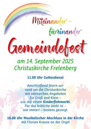 Beginn ist um 11.00 Uhr mit einem Gottesdienst in der Christuskirche Frelenberg. Anschließend feiern wir rund um die Christuskirche (und bei ganz schlechtem Wetter natürlich in der Christuskirche).
